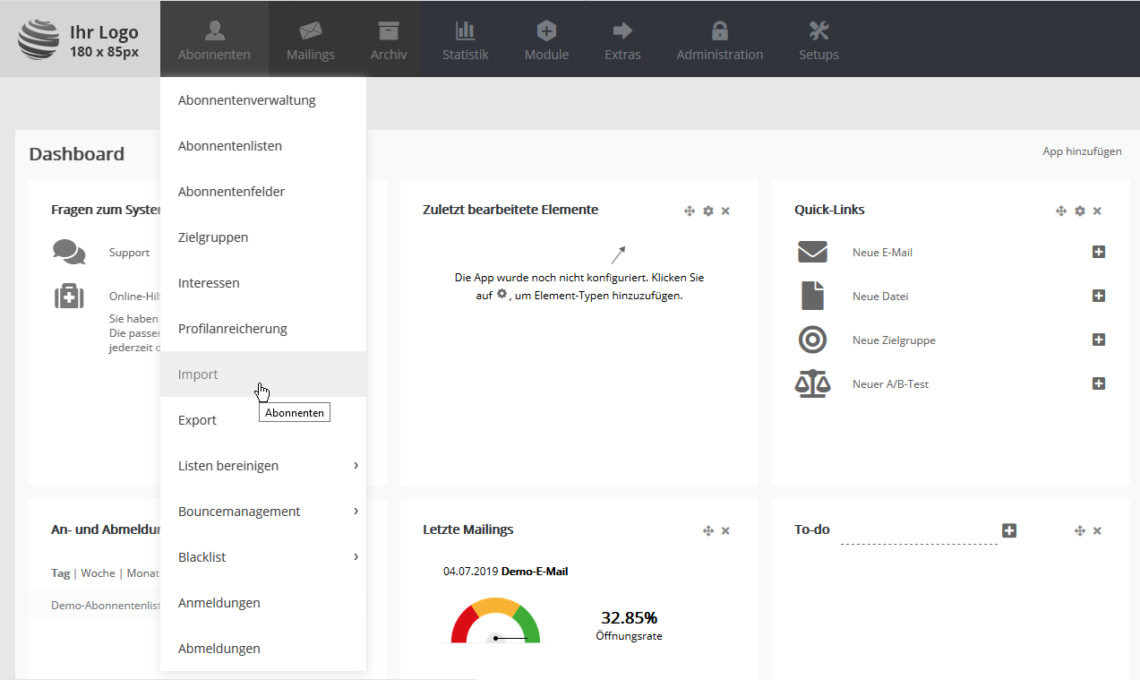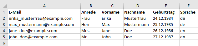 Abonnenten: ImportWahrscheinlich haben Sie bereits eine Liste von Adressen zusammengestellt, die Sie per Newsletter anschreiben möchten. Über das universelle CSV-Dateiformat lassen sich Ihre Adressen aus nahezu jeder Datenbank oder Tabellenkalkulation (z. B. Microsoft Office oder Open Office) exportieren und anschließend in CyMail importieren. Um die Zuordnung der Spalten (z. B. Vorname, Nachname, E-Mail) beim Import zu erleichtern, sollte die erste Zeile Ihrer CSV-Datei aussagekräftige Spaltenüberschriftten enthalten. Ein Beispiel:
