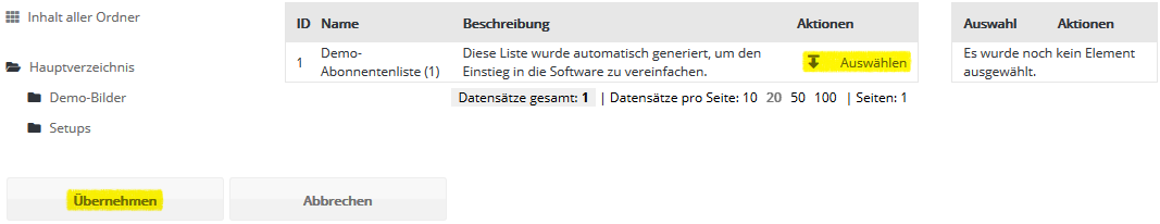 Schritt 3 - AbonnentenlistenWählen Sie nun aus, in welche CyMail Abonnentenliste ihre CSV-Datei importiert werden soll. Falls Sie zuvor keine eigene Abonnentenliste in CyMail angelegt haben (siehe Menü Abonnentenlisten), steht zum schnellen Einstieg die leere Abonnentenliste 'Demo-Liste' bereit. Diese Liste wird in der Regel bei der Einrichtung Ihres CyMail Kontos angelegt und zur Demonstration mit einem Beispiel-Abonnenten befüllt.