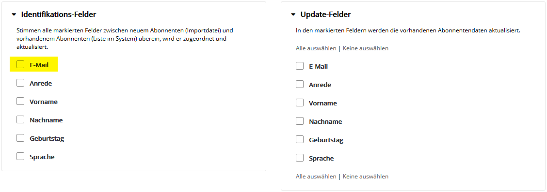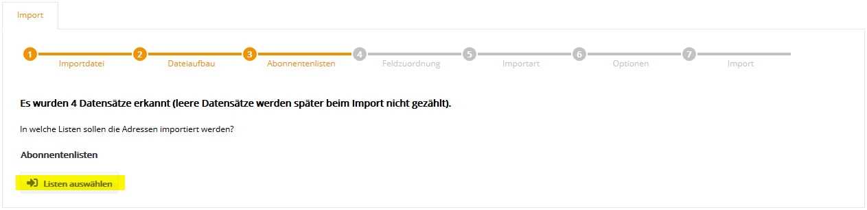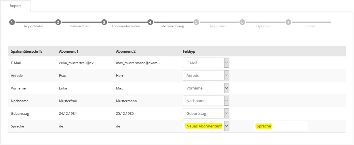 Auch die Auswahl mehrerer Abonnentenlisten ist möglich, falls Sie parallel in mehrere Listen importieren möchten. Klicken Sie nach Auswahl der gewünschten Liste(n) auf 'Übernehmen' und anschließend auf 'Weiter'. Der Name einer Abonnentenliste lässt sich im Menü Abonnentenlisten auch nachträglich jederzeit ändern. Schritt 4 - FeldzuordnungIn Schritt 4 teilen Sie CyMail mit, welche Spalte (z.B. Vorname, Nachname) Ihrer CSV-Datei in welches CyMail Abonnentenfeld importiert werden soll. Zum schnellen Einstieg sind typische Abonnentenfelder wie 'E-Mail', 'Anrede', 'Vorname' und 'Nachname' in CyMail bereits vorhanden.