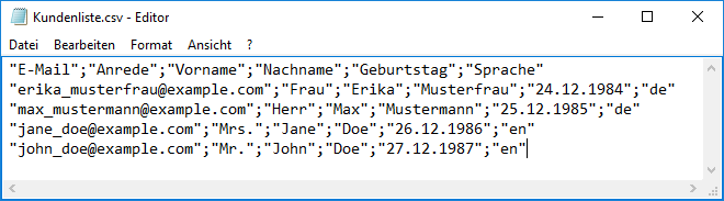 Die Option 'erste Zeile enthält Spalten-Überschriften' gibt an, ob die erste Zeile Ihrer CSV-Datei die Spaltenüberschriften (z. B. Vorname, Nachname, E-Mail) enthält oder sofort mit Abonnentendaten beginnt. Anschließend klicken Sie auf 'Weiter'. --> Tipp: Sollten Sie sich über das Format Ihrer CSV-Datei unsicher sein, können Sie sich deren Inhalt in einem Text-Editor anschauen. Hier ein Beispiel einer CSV-Datei mit Spaltenüberschriften, Semikolon als Spaltentrenner und Anführungszeichen als Texttrenner: