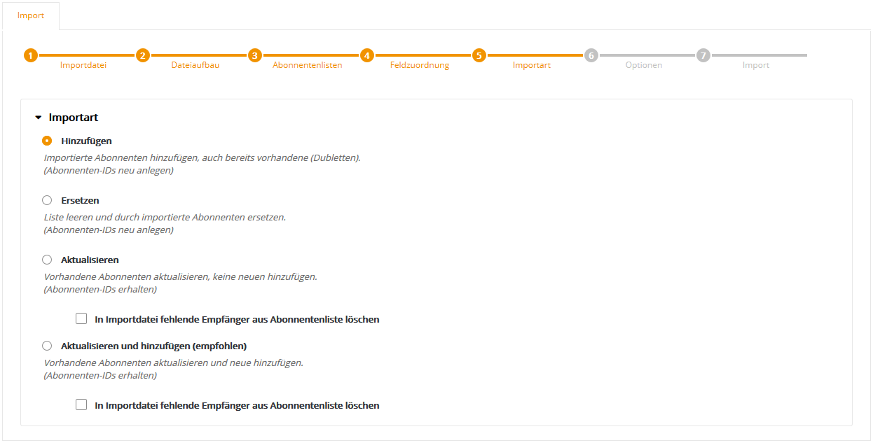 Auf der linken Seite sehen Sie am Beispiel der ersten beiden Abonnenten noch einmal den Inhalt Ihrer CSV-Datei. Auf der rechten Seite wählen Sie bitte den 'Feldtyp', der zum jeweiligen Inhalt passt. Dabei übernimmt CyMail die Zuordnung automatisch, wenn der Name von CSV-Spaltenüberschrift und CyMail-Abonnentenfeld übereinstimmt. Wird automatisch kein passendes Abonnentenfeld gefunden, ist der neue Feldinhalt zunächst auf 'nicht importieren' gesetzt. Wählen Sie in dem Fall entweder eines der vorhandenen Felder aus, oder nutzen Sie die Option 'neues Abonnentenfeld', um ein neues Feld anzulegen und ihm einen Namen zu geben. An dieser Stelle erhalten neue Felder grundsätzlich den Typ 'mehrzeiliger Text', siehe auch nachfolgender Tipp. Klicken Sie anschließend auf 'Weiter'. --> Tipp: Idealerweise sollten Sie sich bereits vor dem Import einmalig die Zeit nehmen, im CyMail Menü 'Abonnentenfelder' alle Felder so anzulegen, dass Feldname und Feldtyp zu Ihren importierten Daten passen. Damit profitieren Sie zukünftig von der automatischen Feld-Zuordnung, was bei wiederkehrenden Importen nicht nur Zeit spart, sondern auch eventuelle Fehler durch unpassende Feldtypen oder die manuelle Feld-Zuordnung verhindert. Schritt 5 - ImportartHier legen Sie fest, wie Ihre neu importierten Daten mit den vorhandenen 'alten' Daten der gewählten CyMail-Abonnentenliste(n) abgeglichen werden sollen.