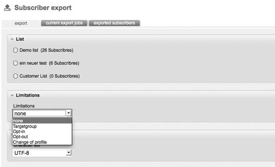 Subscribers lists can be exported from CyMail as CSV – files. An advantage, for example, is that you can back up the address lists in this way. In the tab 'Export’, you can make choices of the lists that have to be exported. Per export only one subscriber list can be chosen. If you only want to export certain data records, you can decide on 'Limitations’. |