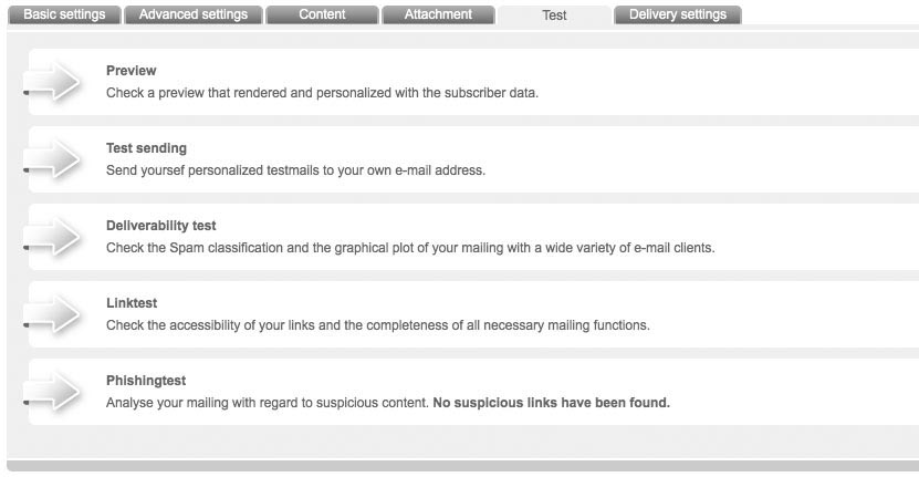 Having finished your newsletter, CyMail offers you numerous testing possibilities. This helps you to optimize your mailing and achieve maximum success before actual dispatch. You can get to the testing functions by choosing the tab 'Test' in the menu in which you edit your mailing. Following tests are available: |