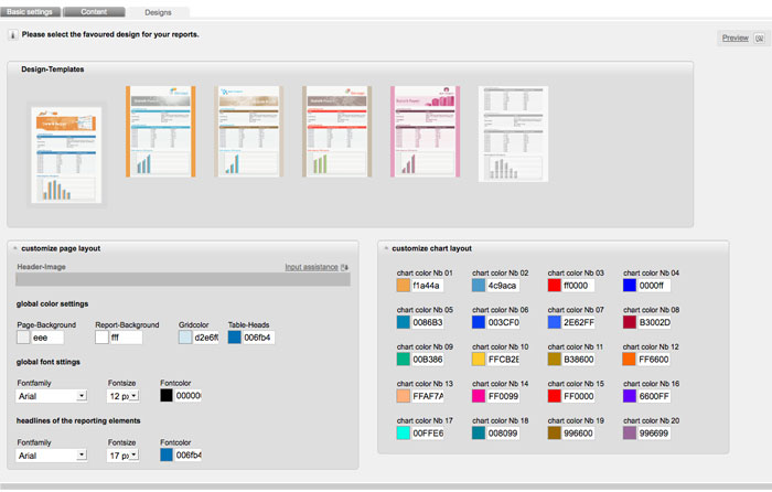 Now you also can adjust the design of your report. Choose the tab 'designs'. By default CyMail suggests you six different layouts. HTML experts can also open the 'advanced settings' below the layouts to edit the html-code. For example you can insert your logo in th header.