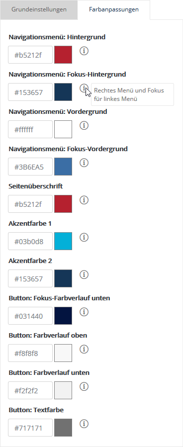 Für die Buttons lassen sich 3 Standardfarben und 3 Fokus-Farben wählen. Sie bestehen jeweils aus einem zweifarbigen Hintergrund und der Textfarbe.