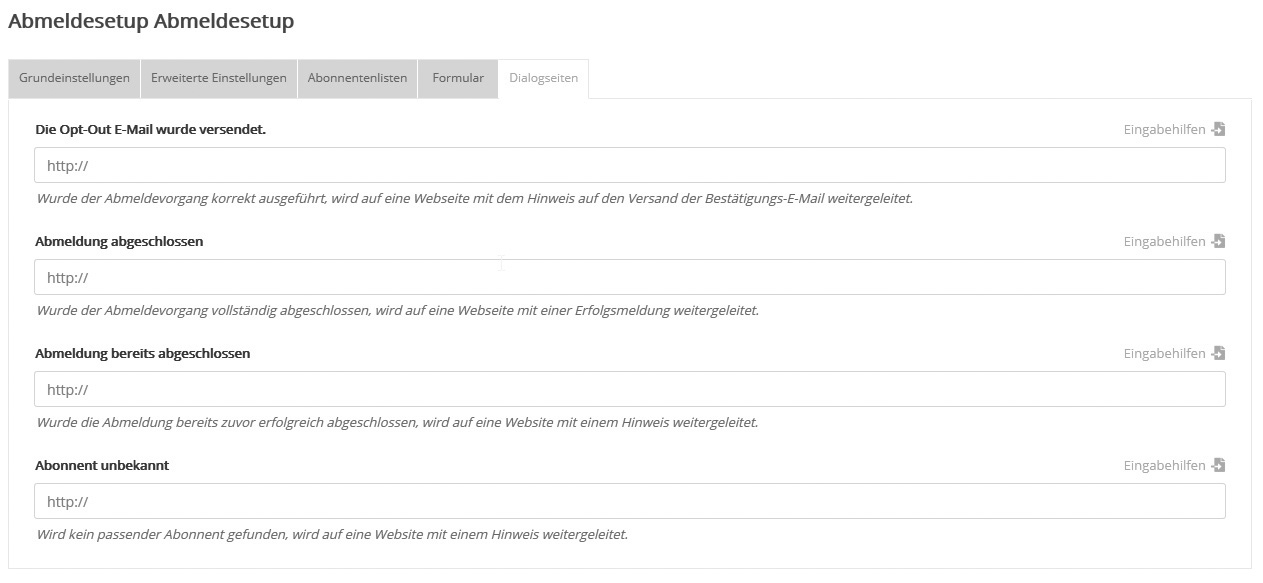 AbonnentenlistenJe nachdem, ob die Abmeldung per Newsletter-Link oder per Website-Formular stattfindet, wird der Abonnent aus folgenden Listen abgemeldet: Variante 1: Abmeldelink im NewsletterFür Standardmails gilt: Zusätzlich zu den auf dem Reiter 'Abonnentenlisten' gewählten Listen findet die Abmeldung auch in den angeschriebenen Listen statt. Für Kampagnen- und Dialogmails gilt dieser Zusatz nicht, da diese nicht an eine bestimmte Liste verschickt werden. Variante 2: Abmeldeformular auf WebsiteDie Abmeldung findet in den unter 'Abonnentenlisten' markierten Listen statt, und wenn vorhanden, dann auch in den direkt im Formular zur Auswahl durch den Nutzer angebotenen Listen (siehe nächster Abschnitt 'Formular'). Beides gleichzeitig ist nicht möglich. Das heißt: Sobald Sie eine Liste im Reiter 'Abonnentenlisten' markiert haben (und damit fest vorgeben), kann sie nicht gleichzeitig im Abmelde-Formular (ab)wählbar sein. Im dem Fall wird sie automatisch aus dem Formular entfernt und umgekehrt. Sonderfall beim Abmeldeformular: Ist keine Liste zur Abmeldung markiert und auch im Formular keine enthalten, dann findet die Abmeldung in allen Listen statt. Damit wird der Abonnent auch aus der 'Abonnentenverwaltung' entfernt. FormularHier erstellt CyMail automatisch den Quellcode für ein Abmeldeformular, das Sie auf Ihrer Website einbinden können. Den Inhalt des Formulars stellen Sie per Drag&Drop zusammen. Die Bedienung ist identisch zum Anmeldeformular-Editor. Nach Klick auf den Button 'Test des Formulars' wird Ihr neues Abmeldeformular angezeigt und die Funktion lässt sich anhand realer Abmeldungen testen. Geben Sie gültige und ungültige Abonnentendaten ein, um die entsprechenden Textmeldungen bzw. Dialogseiten zu prüfen. Ein während des Tests abgemeldeter Abonnent lässt sich unter 'Abonnenten' -> 'Abmeldungen' wiederherstellen. --> Hinweis zu Abmeldungen beim Testversand: Solange es sich um den Testversand eines Mailings handelt, findet bei Klick auf den Abmeldelink keine Abmeldung statt. Stattdessen wird lediglich eine Bestätigung angezeigt, ob das Abmeldesetup korrekt eingerichtet wurde. Erst beim späteren realen Versand findet eine tatsächliche Abmeldung statt und es erscheint die von Ihnen eingestellte Dialogseite, die Sie unter 'Formular testen' jederzeit testen können. Dialogseiten |